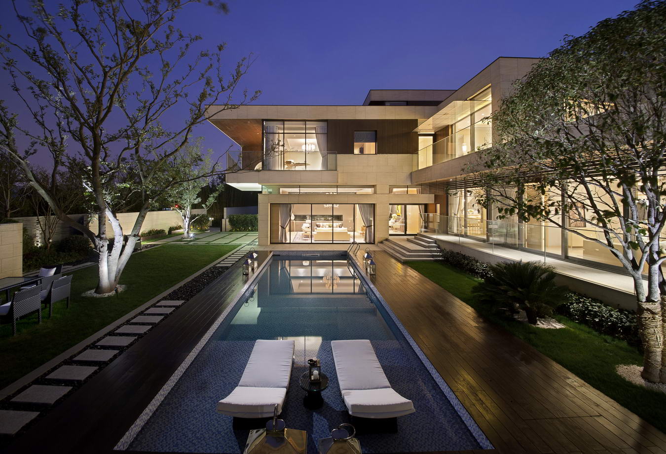 偌大的客廳布置優雅簡約,以具肌理感的淺咖色捫布墻身配合銀灰洞石地臺,為大宅奠下雅致時尚的格調。淡灰色羊毛真絲地毯上,擺放著線條明快的淺灰色Giorgetti沙發及米黃色木質茶幾,在水晶吊燈的映襯下,煥發瑰麗和諧的氣氛。餐廳延續高雅格調,以優雅的Giorgetti扶手椅搭配長型餐桌,加上黑鈦鋼飾框的酒柜及開放式西廚,讓戶主在輕松愉悅的環境中細意品味生活。同層的書房以淺色皮革及楓木為主材,搭配B&B Italia座椅及經典品牌燈具,營造舒適恬靜的工作空間。