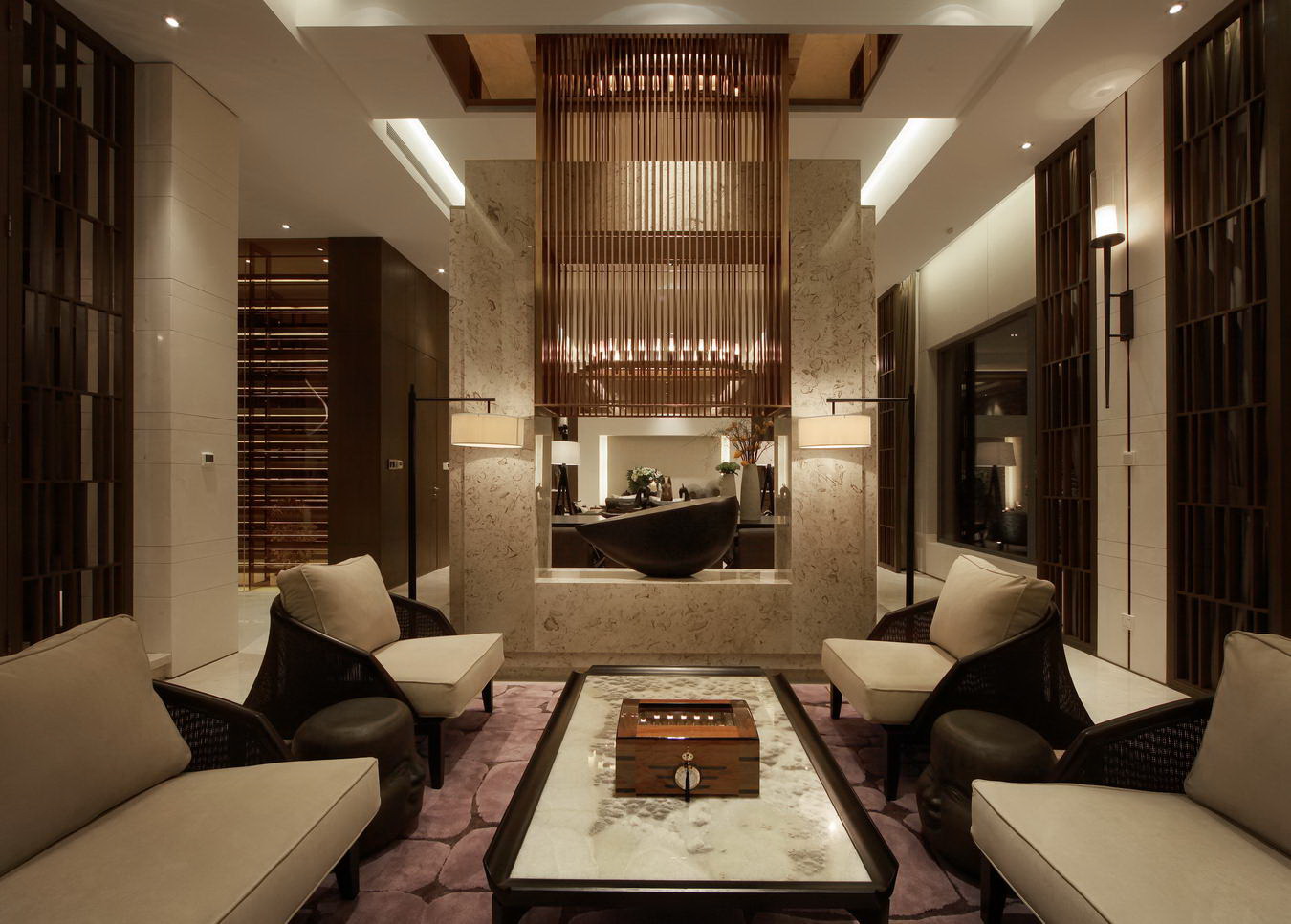 本案是一棟富有文雅氣息的獨立別墅,展現出一派奢華禪意的風格。氣質是透過眼睛傳達出來的心靈悸動。當光和影在空間交錯更迭,空間,隨著視線的角度變化,變得寧靜而自然。日光,毫無遮掩地穿過窗框和玻璃照了進來,華麗感從客廳的石墻上穿越,停在客廳金屬與粗獷石材相互融合的裝飾墻上,這就是高挑的共享,開闊的廳堂所帶來的視覺盛宴。自然之韻,用現代的手法提煉了出來。