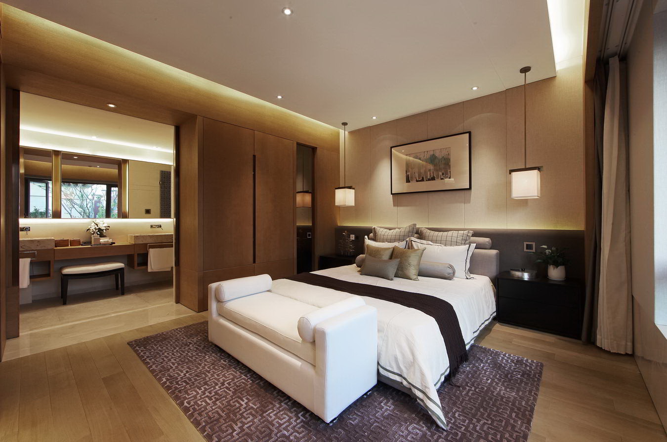 臥室:延續公共空間的味道,臥室也以同樣的方式表現出空間廣闊的舒適感,木飾的自然,燈光的柔美,無聲無息間,被一扇玻璃窗貫穿室內外。自然,和諧,寧靜,舒適。