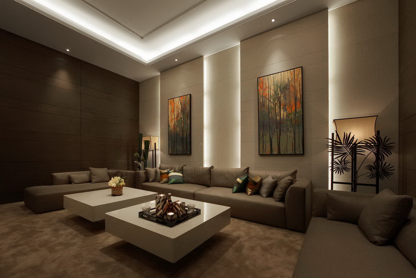 地下室:相比與樓上的寧靜和自然,地下室的空間更顯低調奢華。與其說地下室,不如說是獨立式開放空間。沿著樓梯往下走,迎面而來是直接到頂的透明茶玻隔墻,各類異域風情的紅酒,將會在此絢麗地存在。順著燈光,與和室、雪茄吧、影音室、獨立開放式會客廳形成一個非常完整而動線流暢的休閑空間,其中,和室空間,在燈光的烘托下,時而開放,時而封閉,讓空間很舒暢地變換著,顯得特別恬靜。